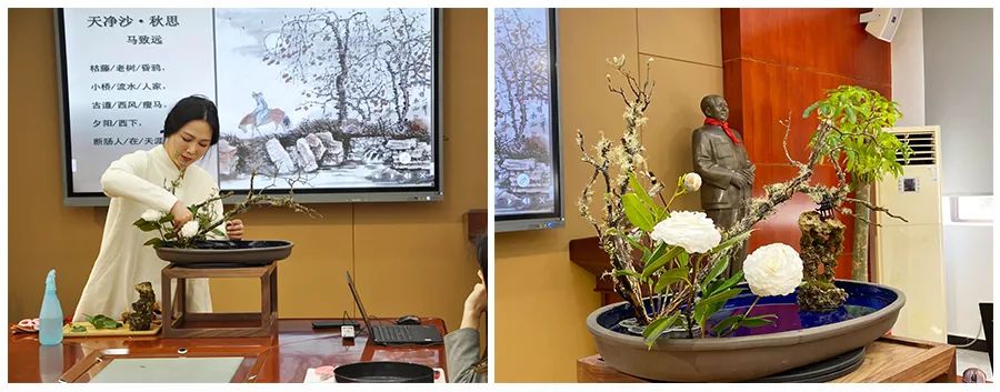 唯美的茶藝與花藝觀賞視頻拉開了此次活動的序幕,大家都沉浸其中,再通過盛總現(xiàn)場花藝展示,讓大家對插花藝術(shù)有了初步的了解。