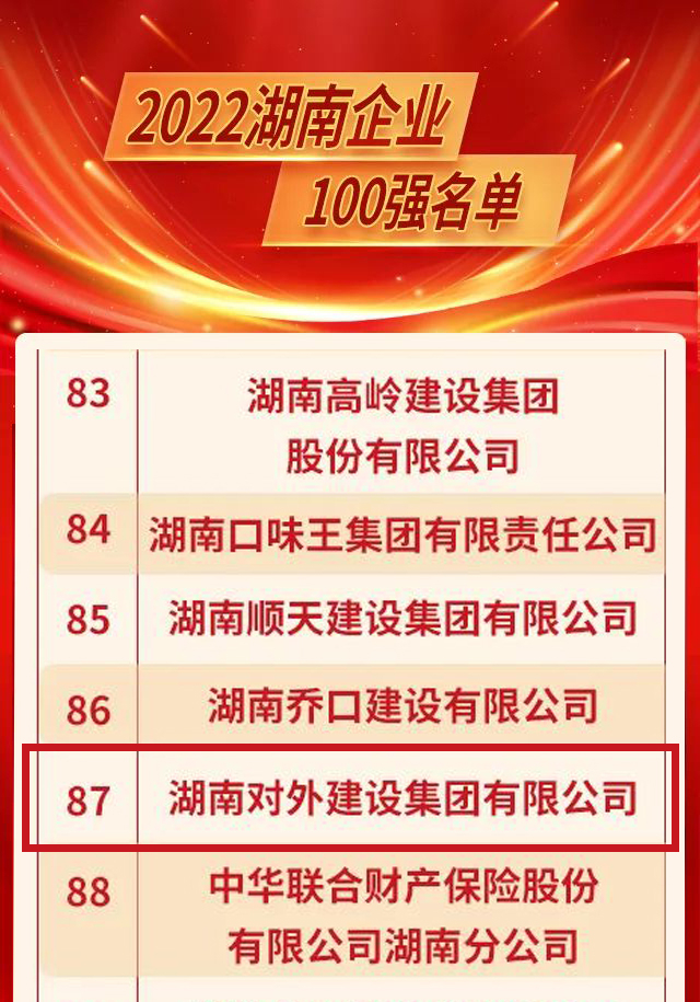 湖南外建位列湖南企業(yè)100強(qiáng)第87位